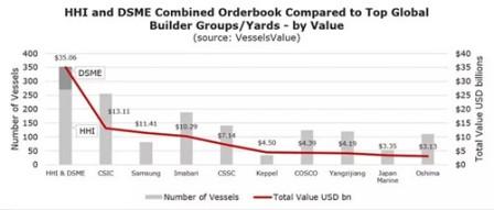 VesselsValue貿易分析(xī)師Court Smith稱(chēng),現代重工與大宇造船如果完成合並(bìng),兩家(jiā)船廠LNG船手持訂(dìng)單將形成大規模的整合,現代重工LNG船手持訂(dìng)單價值將(jiāng)從60億美元翻番至120億美元。