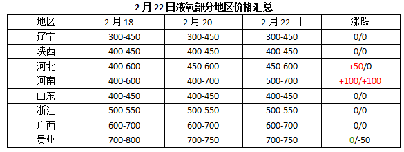 西南地區液氧偏弱運行,其貴州市場參考區間在700-750元左右/噸,市場需求麵氛圍欠佳,下遊按需補貨為主,交投疲軟。四川地區液氧參考(kǎo)區間在650-750元左右/噸(dūn),後期還需跟進下遊需求。