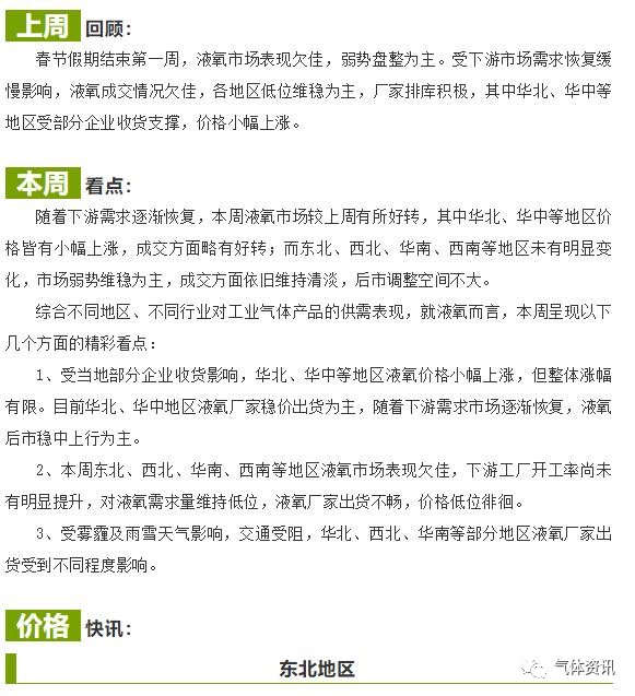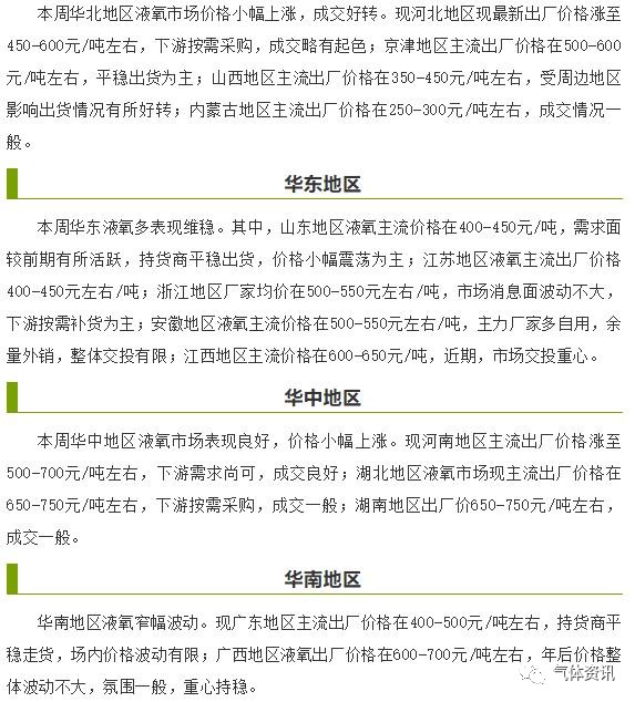 【特氣網】分(fèn)析,隨著(zhe)下遊市場逐漸恢複開工,對(duì)液氧需(xū)求量穩步增加,液氧(yǎng)市場穩中向好,其中(zhōng)華北、華東、華中等地區液氧價格存小幅上漲空間,而東北、西北、西南等恢複較慢(màn)地(dì)區行情(qíng)橫盤整理為主。