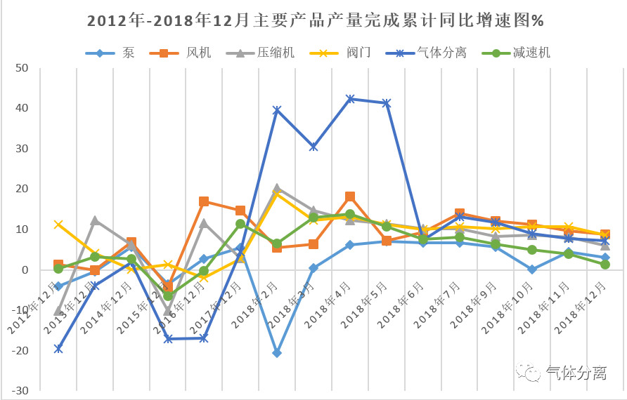2018年1-12月,通用機械行業在國家統計(jì)局統(tǒng)計的6種主要產品產量完成穩中有增,其中:閥門、氣體(tǐ)分離(lí)及液化設備產量分別為486.34萬(wàn)噸和4.60萬台,增速較上年分別提(tí)升5.75和(hé)2.87個百分點;泵、風機、壓縮機、減速機增速分別比上年下降2.24、5.95、9.14、9.96個百分點,產品完成情況見表一。從產品完成累計同比增(zēng)速圖一看,2018年產(chǎn)量完成增速趨穩、態勢趨緩。