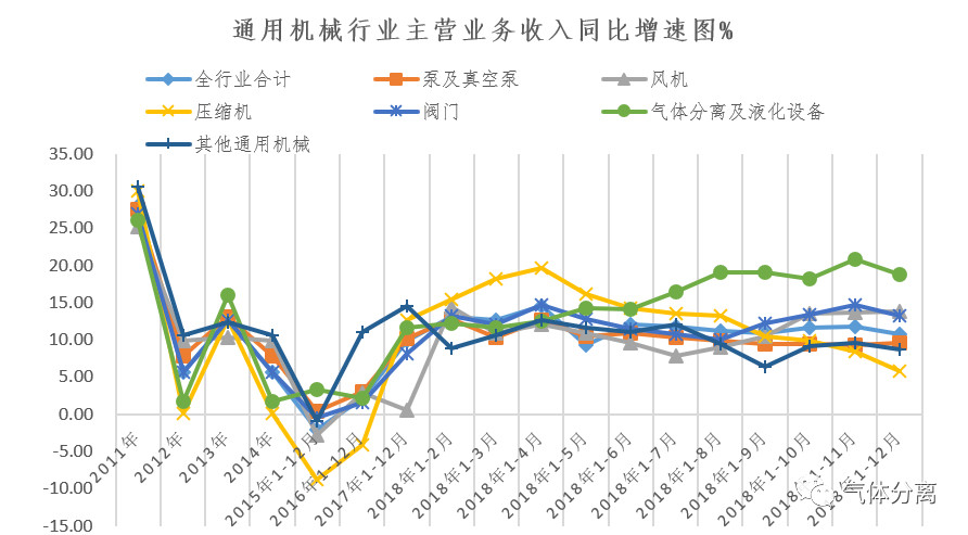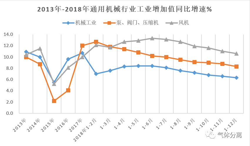 2.行業發展呈趨穩趨緩態勢。通用機械行業2012年出現調整,至2015年行業經濟運行狀態似顯現(xiàn)觸碰(pèng)至低(dī)點,2016年全行業經濟運行態勢得以恢複,並(bìng)緩慢增長,也為(wéi)後期發(fā)展打下了的(de)基(jī)礎。2017年、2018年上(shàng)增年行業經(jīng)濟運行保持穩中有升有發展態勢,2018年下半年行業發(fā)展增速趨緩,截止12月底,泵、閥門(mén)、壓縮機增加(jiā)值增速較上年回落3.7個(gè)百分點,其它通用機械增加值增速回落2.5個百點。據對行業153家重點企業的(de)統計(jì)生產、銷售、利潤同比增速都較上年有所回落。