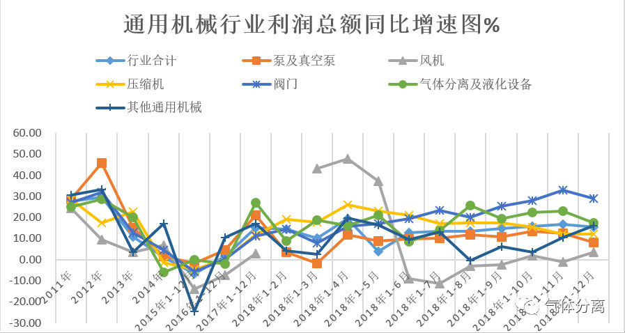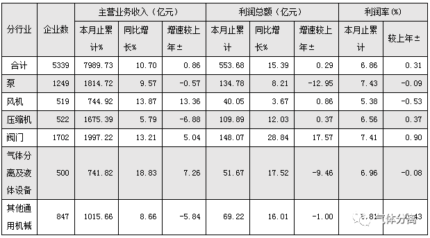 3.利潤總額增長分化。風機行業利潤總額(é)同比增長3.67%,比收入增速低10.2個百分點;閥門利潤(rùn)總(zǒng)額同比增(zēng)長28.84%,比收(shōu)入增長高15.63個(gè)百分點;壓縮機,利(lì)潤總額同比增長12.03%,比收入增長高6.24個百分點;泵、氣體分(fèn)離及液化設備(bèi)收入與利潤保持同步增長。