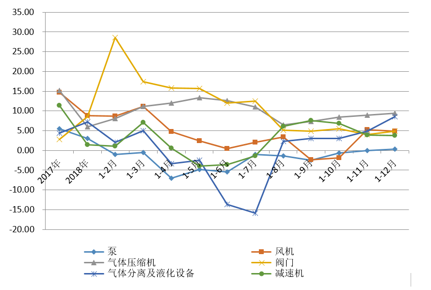 從2019年各月產量統計(jì)數據看,上半年產品產量(liàng)增速各行業波動起伏較大,且(qiě)周期各異,下半年(nián)產量完成增速趨於平穩,在統計(jì)的六種產品中,氣體壓縮機、氣體分離及液化設備、減速機增(zēng)速較去年提升,泵、風機、閥門同比增速都較上年有(yǒu)所回落,回落幅度逐漸收窄(zhǎi),產量增速趨穩。