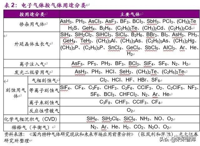 另外,在半導體製造業中,氣體還可以分為大宗氣體和電子氣體,大宗氣體是指集中供應且用量較大(dà)的氣體,如N2、H2、O2、Ar、He 等(děng)。電子氣體主要是半導體製造的每一個過(guò)程如外延生長、離子注入、摻雜、刻蝕清洗、掩蔽膜生成所用到的(de)各種化學氣體,如高(gāo)純 SiH4、PH3、AsH3、B2H6、N2O、NH3、SF6、NF3、CF4、BCI3、BF3、HCI、CI2 等,又可稱(chēng)為電子特種氣體。