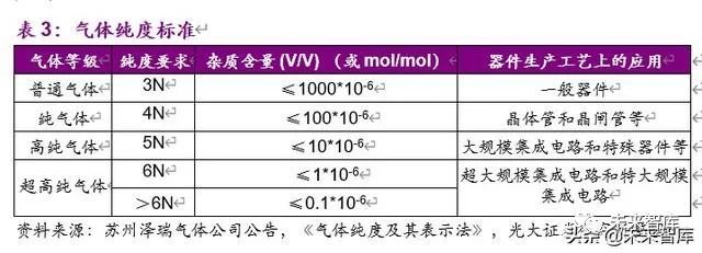 根據氣體的純度不同,通(tōng)常又將(jiāng)氣體純度分為四級,即普通氣體、純氣體、高純氣體和超高純氣體,下表(biǎo) 3 給出氣體純度等級和器件生產工(gōng)藝上的應(yīng)用。