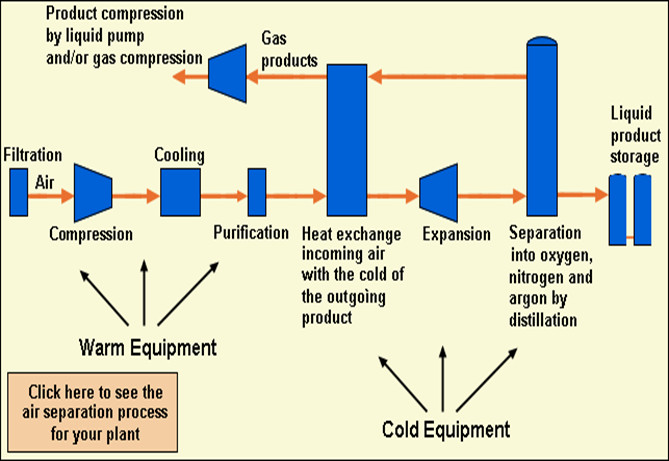 空分設備就是以(yǐ)空氣為原料,通過壓縮循環深度冷凍的方(fāng)法把空氣變成液態,再經過精餾(liú)而從液態空氣中逐(zhú)步分離生(shēng)產出氧(yǎng)氣、氮氣、氬氣、液體(tǐ)產品及稀有氣體的設備。