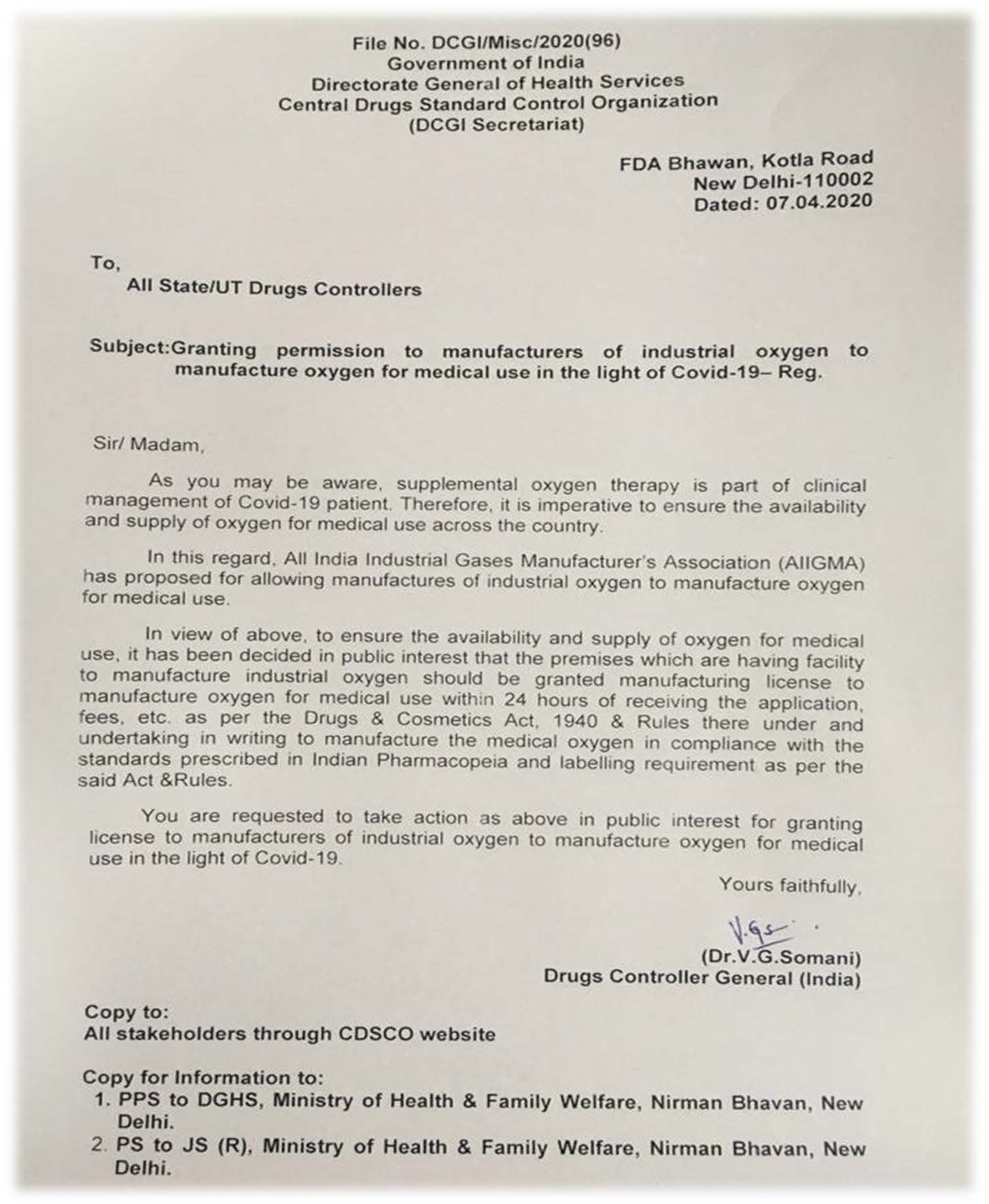 考慮公眾利益,應全印度工業氣體製造商協會要求(建議(yì)),印度政府允許工業氧氣用於醫療用途——具備製造工業用氧氣設(shè)施的處所,應(yīng)在接(jiē)獲申請後24小時內,獲發製造(zào)醫用氧氣的牌照和(hé)費(fèi)用等,根據1940年(nián)“藥品和化妝品法”及其規則,並以書麵形式承諾生(shēng)產符合“印度藥典”中描述的標準的醫(yī)用氧(yǎng)氣(qì),以及根據所述法案和規則的標簽要(yào)求。