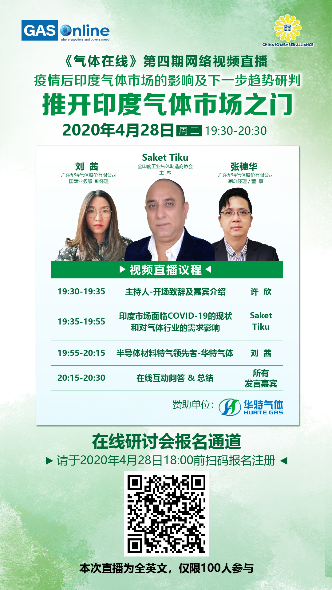 4月28日(rì)19:30-20:30,由GASonline《氣體在線》推出的第四期直播視頻研討會(huì)——“推開印度氣體市場之(zhī)門”,將邀(yāo)請重要嘉賓——全印度工業氣體製造商(shāng)協會主席Saket Tiku先生,在中、印氣體供需信(xìn)息共享的基礎上,深入分析Covid-19疫情對印度及中國經濟整體發展和氣體行業(yè)的影響,並針對(duì)後疫情時代(dài)印度(dù)氣體市場發展情(qíng)況,深(shēn)入研判中國氣體設備製造商麵(miàn)臨的商機與營銷合作模式。