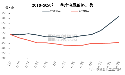 2020年1季度價格走勢呈現先跌後漲走勢,但漲勢較小。據卓創(chuàng)資訊統計,2020年1季度中國液氧市場均價459.1元/噸,同比下跌17.2%。