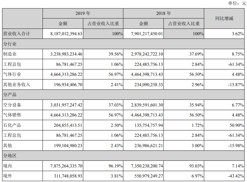 4月30日,杭氧股份公布(bù)2019年業績(jì)報告,其(qí)實現營(yíng)業收入為81.87億元(2018年:79.01億元),同比增長3.62%;實現歸屬於上市公司股(gǔ)東的淨利潤為(wéi)6.35億元(2018年:7.41億元),同比下降14.25%。