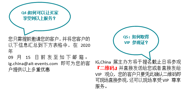 您好!非常感謝您對IG,China展會21年來的支持,也感謝您成為2020年IG,China的參展商。今年我們將特別開展『展商邀請VIP觀眾計劃』,我們將特別提供一部分VIP觀眾名(míng)額給您,用來邀請您的國內(nèi)外買家蒞臨2020年IG, China 展會現(xiàn)場參(cān)觀您的展位。