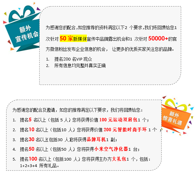 注:為保(bǎo)證VIP觀眾的質(zhì)量,我(wǒ)們會(huì)對推薦的VIP觀眾進行電話審核。經(jīng)過主辦方的篩選及確認信(xìn)息完(wán)整,即為您(nín)送上精(jīng)美禮物。