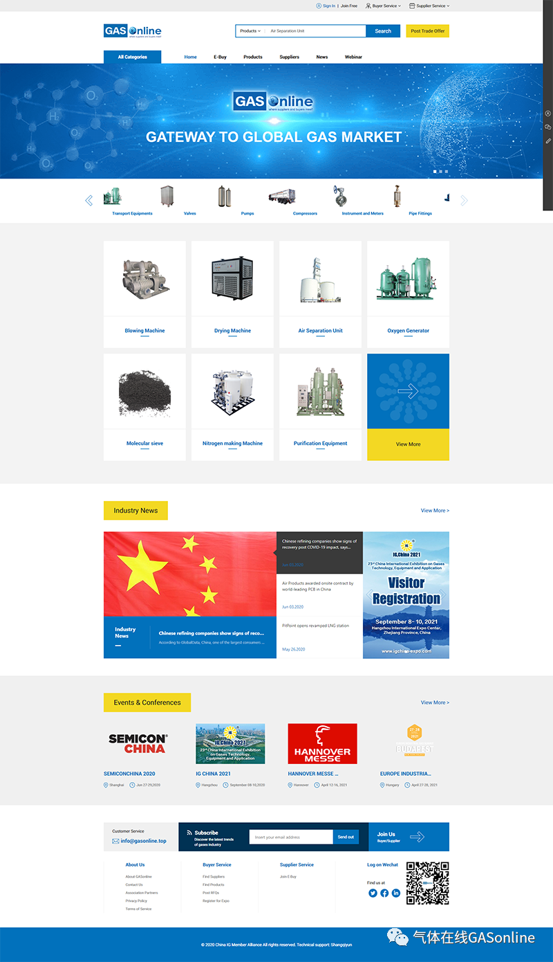 把握機遇,共(gòng)赴挑戰。“互聯網+”時代,全(quán)球(qiú)唯一專注於氣體行業全產業鏈(liàn)的全(quán)英文采(cǎi)購貿易垂直平(píng)台——GASonline《氣體在線(xiàn)》網站,應中(zhōng)國氣體企業進軍國際市場發展所需,蓄勢啟航!