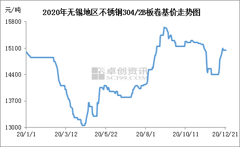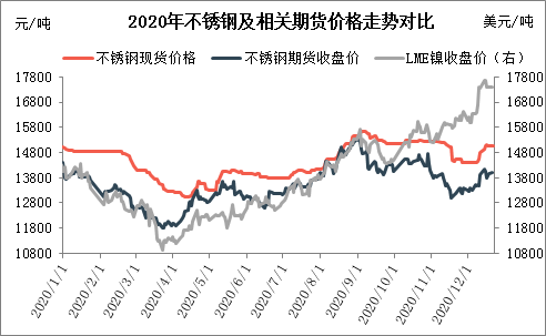 從年內整體走勢來看,一季度下跌明顯,二、三季度(dù)震蕩上漲為主,四季度跌後反(fǎn)彈。一季度來看,1-2月份(fèn)受傳統春節(jiē)假期影響價格調(diào)整有限,春節過(guò)後公(gōng)共衛生事件對市場的影響(xiǎng)逐步放大,不鏽鋼市場(chǎng)供需基本麵壓力明顯上升,加之倫鎳電子盤重心繼續下移,不鏽鋼承壓價格麵連續下挫。二、三季度來看,4月中上旬公共衛生事件的影響仍在延續,市價仍在下(xià)行。隨後在相關政策刺激帶動、需求逐步恢複、強力成本支撐、鋼廠檢(jiǎn)修帶動等輪番影響下,價格重心明顯上移。四季度來看(截至12月22日),行情高位風險下,市價承壓趨弱,及至11月中旬及之後,在部分鋼廠指導價格的下調及拉漲帶(dài)動下(xià),市價跟隨出現短(duǎn)期快(kuài)速的跌後反彈,市場貨源消化力度明顯加速。元旦將近,市場銷售壓力有所顯(xiǎn)現(xiàn)。