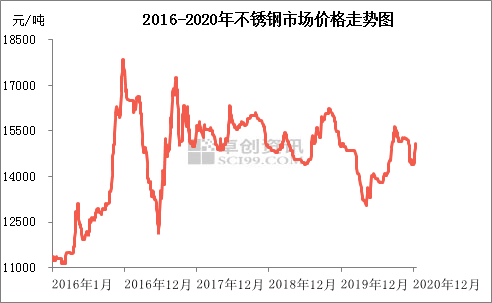 截至2020年12月22日,中國不(bú)鏽鋼市場年內整體呈現跌(diē)後(hòu)反彈再回落態勢。從點價(jià)格來(lái)看,2020年內市價高點出(chū)現在(zài)9月上旬,為15650元/噸;市價低點出現在4月中旬(xún),為13050元/噸,年內高(gāo)低點價差在2600元/噸,與2019年1850元/噸相比(bǐ)擴(kuò)大750元/噸。從年均價(jià)來看,2020年市場均價在14433.06元/噸(dūn),較2019年15148.50元/噸下跌4.72%。
