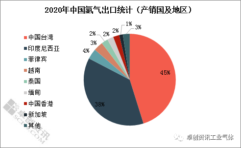 從氬氣出(chū)口產銷國及地區來看,受(shòu)電子等需求帶動,2020年出口至台灣的量達到27550.84噸,占(zhàn)比達到(dào)45%,升至第一(yī)位,同比增加38.1%;受公共衛生事件影響,2020年印(yìn)尼及東南亞其他地區需求同比減少明顯,其中(zhōng)出(chū)口至印尼的量為22852.28噸,占比38%,同比減少43.4%;出口至菲律賓、越南、泰國(guó)、緬甸等(děng)其他東南亞國家的量(liàng)占比在2%-4%。另外(wài)對中國香港(gǎng)、新加坡等地亦有部分出口。