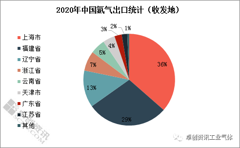 從收發地來看,2020年中(zhōng)國氬氣出口主要來自18個(gè)省(shěng)市(shì)自治區。其中受印尼及(jí)中國台灣需求較為旺盛支撐,上海(hǎi)市出口量達22227.6噸,占比高達(dá)36%,居首位;福建亦受到帶動,出口量為17521.14噸,占比29%,列第二位;遼寧出口量為7947.8噸,占(zhàn)比13%,排在第三位。另外,浙江、雲南(nán)、天津等市場亦有(yǒu)部分出口。