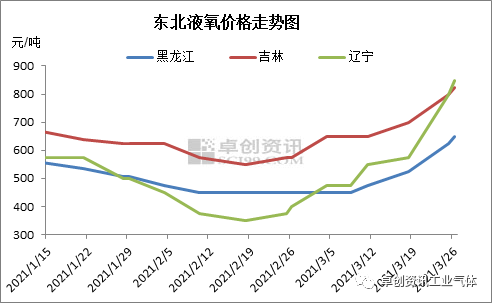 [導語]春節返市以來,東北(běi)地(dì)區市場表現平淡。由於地理位置影響,天氣寒冷影響(xiǎng)需求(qiú)恢複。進入3月下旬,天氣陸(lù)續轉(zhuǎn)暖,隨著小鋼廠陸續(xù)開工,液氧需求明顯好轉,工業氣體價格乘勝追漲。 當(dāng)前東北地區氣體供應(yīng)呈低位水平,在此支撐下,東(dōng)北地區氣體價格(gé)漲勢明顯。據卓創資訊(xùn)數據(jù)監測,截(jié)至目前,東三省液氧均價逼(bī)近800元/噸,價格較節後上漲超過300元/噸(dūn),月環比漲幅(fú)超(chāo)過60%。 從市場供應來看,據卓創資訊了解,吉林(lín)主力企業2月一套空(kōng)分停產,市場(chǎng)供給資源減少(shǎo)。但是需求方麵,由於節後鋼廠需求旺盛,在鋼廠收貨支撐下,價格出現較大漲幅,截至目前,吉林液氧漲至800-900元(yuán)/噸,價格(gé)較節後上漲250元/噸,月環比漲43.48%。另外黑龍江和遼寧地區(qū)配套鋼鐵空分保生產(chǎn)為主,液體外銷量減少,疊加(jiā)主力企業檢修,市場資源供應偏(piān)緊(jǐn)張。截至目前,黑龍江液氧漲至550-750元/噸,價格較節後上(shàng)漲200元/噸,月環比漲44.44%,遼寧液氧(yǎng)漲至800-900元/噸(dūn),價格較節後上漲(zhǎng)475元/噸,月(yuè)環比漲126.67%。 另一方(fāng)麵,通常東北地區與河北地區氣體聯動性強,但由於今年河北(běi)地區鋼廠限產管控加嚴,河北資源流入東北地區資源減少,其中上周五唐山市繼續發布鋼鐵行業(yè)企業限(xiàn)產減排措施通知,3月(yuè)20日開始(shǐ)減排比例30%-50%,唐山限產(chǎn)從不定期限產變為常(cháng)態(tài)化(huà)限(xiàn)產。目前(qián)唐山鋼(gāng)企仍按要求執行限(xiàn)產,卓(zhuó)創資訊數據監測,本周唐山高爐開工率55.37%,較上(shàng)周同期下降2.48個百分點,高爐產能利用率68.6%,較上周同期(qī)下降(jiàng)2.35個百分點。高爐開工率維持低位水平,河北區域內供需兩弱局麵延續。 另外,液氬由於供應減少和出口等(děng)方麵支撐,價格亦較大上漲。截至目前,東三省液(yè)氬均價漲至1150元/噸,價格(gé)較節後上漲416元/噸(dūn),月(yuè)環比漲(zhǎng)56.82%。其中吉(jí)林地區由於供應緊張,主流出廠漲至1300-1350元(yuán)/噸,遼寧地區(qū)出口增多,主流出廠漲(zhǎng)至1100-1190元/噸,黑龍江市場啟動較慢,價格漲(zhǎng)幅不大。近期液氮市場需求平穩(wěn),價格穩中上行。截至(zhì)目前,東三省液氮均價漲(zhǎng)至603元/噸,價格較節後上漲125元/噸,月環比漲26.2%。 後市來看,各方因素疊加下,市場需求持(chí)續增量(liàng)和資源供給減少對氣體價格仍有支撐。但是由於價格拉漲(zhǎng)過快,下遊接貨或謹慎,且(qiě)隨(suí)著吉林主力(lì)企業裝置恢複(fù),供應量或有增(zēng)加。卓創(chuàng)資訊(xùn)預計下周東北地區工業(yè)氣體價格(gé)高位震蕩。