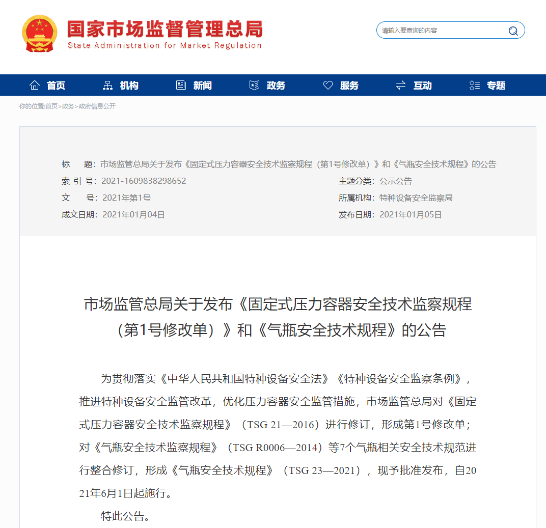 為貫徹落實《中(zhōng)華人民共和國特種設備安全法》《特種設備安(ān)全監察條例》,推(tuī)進(jìn)特(tè)種設備安全監管改革,優化壓力容器安全監管措施,市場監管總(zǒng)局(jú)對《固(gù)定式壓力容器(qì)安(ān)全技術監察規程》(TSG 21—2016)進行修訂(dìng),形成第1號修改單;對《氣瓶安(ān)全技術監察規程》(TSG R0006—2014)等7個氣瓶(píng)相關安全技術規範進行整合修訂,形成《氣瓶安全技術規程(chéng)》(TSG 23—2021),現予批(pī)準發布,自(zì)2021年6月1日起施行。
