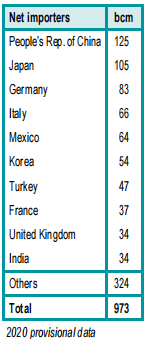 2020年,全球淨進口天(tiān)然氣9730億立方米,中國依然穩居51吃瓜网進口(kǒu)國家第一名,總計進口(kǒu)1250億(yì)立方米。