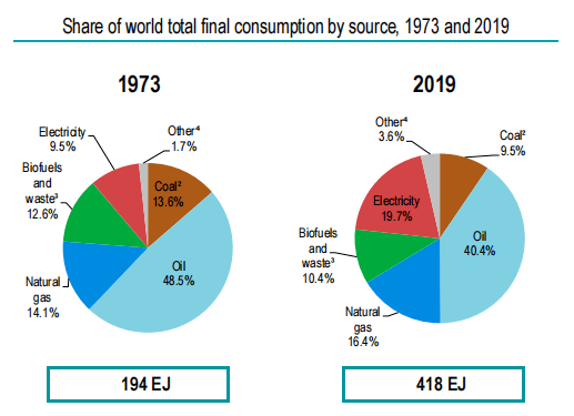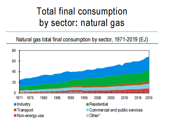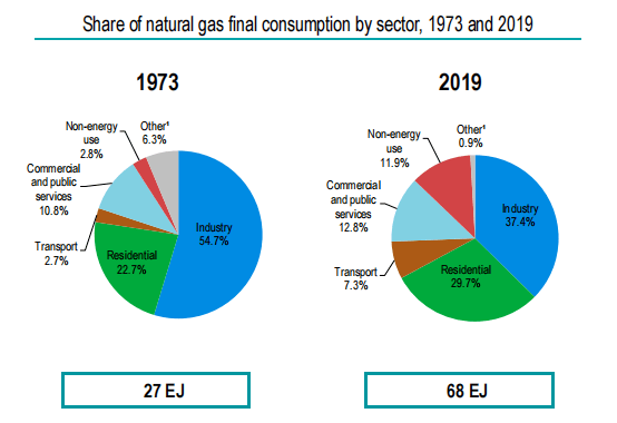 到2019年,全球能源(yuán)最終消費量為(wéi)418EJ(艾焦,單位為10的18次(cì)方焦耳單位),較50年前增長2.15倍。從比例上看,天然(rán)氣的最終消費(fèi)比例為16.4%,僅較50年前增加2.3%。