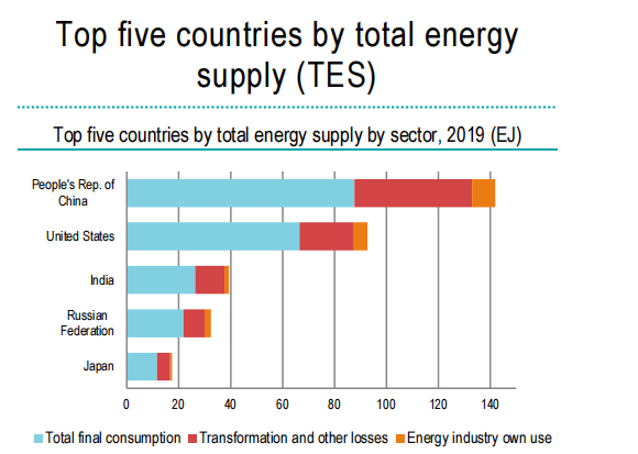 2019年,IEA統計(jì)的前五大能源生(shēng)產國分別為:中國(超140EJ),美國(超90EJ),印度(40EJ),俄羅斯(約(yuē)36EJ),日本(19EJ)。