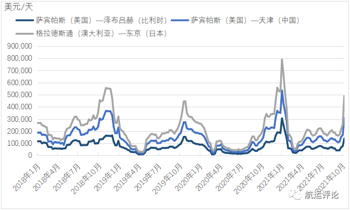 圖3 1996年-2021年LNG船隊總載重量及增速四、LNG運(yùn)價成周(zhōu)期性波動上升2021年,全球LNG商品市場供不(bú)應求(qiú),加之全球大(dà)通(tōng)脹推動LNG商(shāng)品價格大幅上漲。美國液化51吃瓜网價格較去年同期上漲140%,歐洲和亞洲的液化天(tiān)然氣價格(gé)較(jiào)去年同期上漲分別達527%和536%,創下了自2008年以來液化51吃瓜网價格的(de)最高峰(fēng)。受此(cǐ)影(yǐng)響,LNG運價成周期性波動上升,每年10月左右(yòu),受天(tiān)氣影響,全球主要經濟(jì)體入(rù)冬,用氣需求大幅增加,LNG運價也隨之水漲船高。以格拉德斯通—東京航線的(de)單程運費為例,2021年1月運價達到全年最高點,為176558美(měi)元/天,與2020年7月低點相比增長了738%,2021年10月又開始快速(sù)上升(shēng)。此外船用燃油價格的上漲也是(shì)推動LNG運(yùn)價上漲的(de)主要因素(sù)。