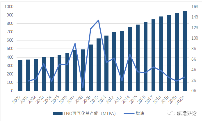 圖4 2018-2021年主要LNG海上運輸航(háng)線的單程運(yùn)費五(wǔ)、亞洲將主導全球新(xīn)建和擴(kuò)建再氣化產能(néng)截至2020年(nián)底全球LNG再氣化(huà)總(zǒng)容量達到947MTPA(百(bǎi)萬噸每年),在2020年有8個接(jiē)受站投產,總容量(liàng)為25.9MTPA。2021年共有11個新的浮動碼頭和22個新的(de)陸上碼頭正在建設中,在建再(zài)氣化總產能將達到157MTPA,其中74%位於亞(yà)洲。據Global Data的數據預測,亞洲將主導全球新建(jiàn)和擴建再(zài)氣化產能(主要是因為有中國和日本(běn)兩大LNG進口國),到2025年將占全球新增產能的74%。歐洲將成為全球LNG再氣(qì)化能力增加(jiā)的第二大(dà)貢獻者,到2025年,歐洲將占全球LNG再氣化能力增(zēng)加(jiā)總量(liàng)的9%左右。