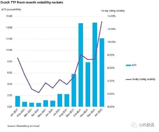 TTF當月合約價的14日滾動波動率在1月創下創下13.2%的紀(jì)錄最高水平(píng),是去年同期(qī)數值的兩倍,同時比2021年均值(zhí)高九個(gè)百分點。