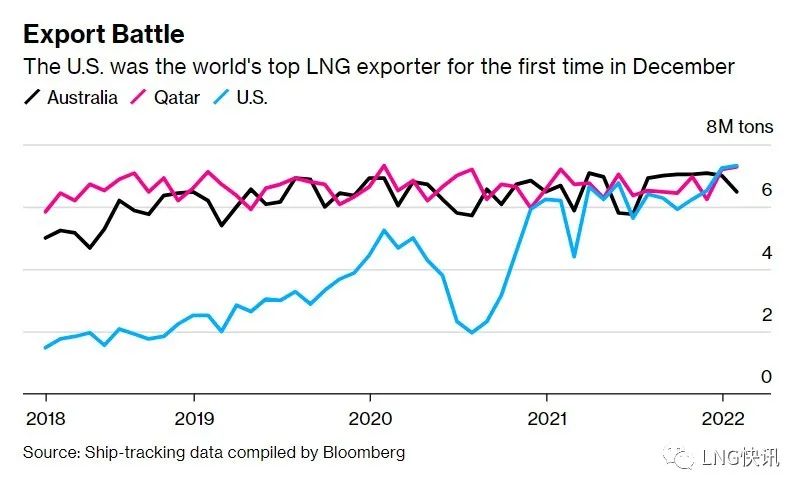 此前受歐洲能源危機以及俄烏嚴峻局勢的(de)影響,美國與歐洲的液化51吃瓜网貿易量激增,並於去年12月超過卡塔(tǎ)爾(ěr)和澳大利亞,首次成為全球第一大液化51吃瓜网出(chū)口國。