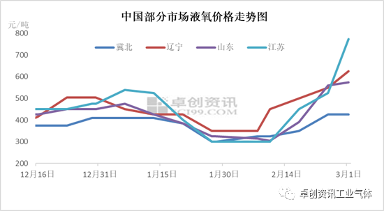 [導語]元宵節以後,市場複工複產(chǎn)節奏加快,部分地區鋼(gāng)廠采購下,市場交投積極性提升,從而支撐價格(gé)抬高,多地液(yè)氧價格漲勢明顯。 目前(qián)進入元宵節後第二周,下遊(yóu)終端陸續複工,消費逐步回暖,市場(chǎng)剛需強度逐(zhú)步走高。北方地區冬奧會結束以後,京津冀及(jí)周邊區域鋼廠開工負荷提(tí)升,液(yè)氧需求有所回暖,整體市場向好。據卓創資訊數據監測,截至今日中國液氧(yǎng)市場均價469.5元/噸(dūn),環比上周均價漲(zhǎng)7.97%。 具體來看,遼寧地區液氧價格持續上調,主因節後區域內主力企業檢修,液(yè)氧供給減量,其中鞍鋼本部和(hé)鮁魚圈分別有(yǒu)空分裝置檢(jiǎn)修10天;月下旬,營口盈德空分裝置(zhì)輪檢半個月左右,液氧(yǎng)供給減少。截至3月1日,遼寧主(zhǔ)流出廠漲至600-650元(yuán)/噸,較春(chūn)節返(fǎn)市首日價(jià)格(gé)上漲78.57%。冀北主流出廠漲至(zhì)400-450元/噸,較春節返市首日價格上漲21.43%,冬奧會結束以後,區域內鋼廠高爐有複產計劃,液氧需(xū)求(qiú)逐漸回暖,價格重(chóng)心上移。江(jiāng)蘇地區主力出廠漲(zhǎng)至750-800元(yuán)/噸(dūn),較(jiào)春節返(fǎn)市(shì)首(shǒu)日價格上漲158.33%,價格漲勢明顯,主要因為春節期間價格偏低,節(jiē)後返市,隨著液位下降,市場探漲意願明顯(xiǎn),同時區域內主力企業檢修,疊加鋼廠采購支撐價格上(shàng)調。山東地(dì)區液氧價格先抑後揚,春節期間采購寥寥,廠商被動累庫,出貨(huò)壓力(lì)下價格下調(diào),主流(liú)出廠降至260-350元/噸。元(yuán)宵節以後,市場(chǎng)逐漸複蘇(sū),價(jià)格出現明顯(xiǎn)漲勢,主流出廠(chǎng)漲至550-600元/噸,市場氛圍良好,其中魯南地區受蘇(sū)北需求支撐,價格偏高。 後市來看,隨著相關政策持續向好調整,市場需(xū)求恢複潛力(lì)也在不斷加大。其中在國家“穩中求進”的大方針(zhēn)下,基(jī)建投資或將成為主要的發力點之一。3月作為鋼材銷售旺季(jì),鋼廠生產積極性或進一步提升,從而支撐液氧需求持續增量。但(dàn)市場仍存在不確定性,例如多(duō)地(dì)公共衛生事件反(fǎn)撲,局部市場交投受限。短期來看,3月中上旬(xún)“兩會”和殘奧會舉辦(bàn),京(jīng)津冀及周邊區域鋼廠短期生(shēng)產仍會受限(xiàn),隨著采暖季結束,鋼廠逐漸提量增產,卓(zhuó)創資訊預計液氧市場呈穩中上行局麵。