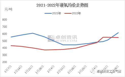 隨著天氣也開始轉(zhuǎn)暖,下遊工地逐漸開工,基建需求明(míng)顯恢複,同時各地鋼企生產積極性有所提升(shēng),支撐液氧需求放量,液氧自春節長(zhǎng)假後持續上行。但是近期市場氛(fēn)圍開始有所轉淡(dàn),多地交通不(bú)暢疊加運輸成本上升影響下遊需求釋放,價格處於震蕩小降狀態(tài)。據卓創資訊數據監(jiān)測,截至上周(zhōu)末,中國液氧市場均價551元/噸,環比上周降0.72%,同比去年降11.01%。