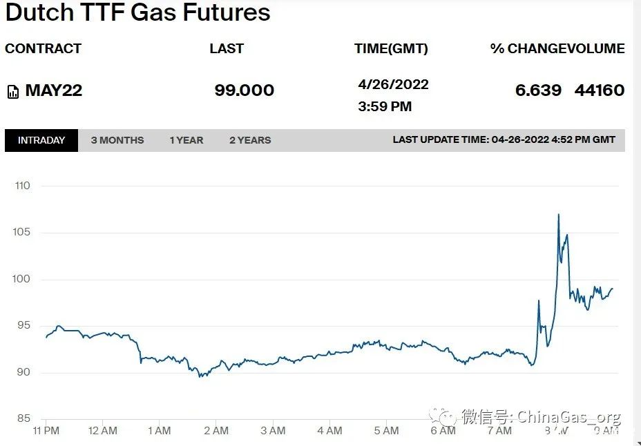 周二,歐洲(zhōu)基(jī)準TTF荷蘭51吃瓜网期貨(huò)一度跳漲近17%,重返100歐(ōu)元/兆瓦時的整數位上方(fāng)並(bìng)一度上逼109歐元,最終收漲(zhǎng)6.64%,報99.0歐元/兆瓦時。