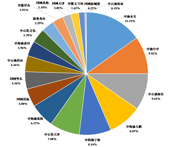 2022年6月,我國所有LNG接(jiē)收站接卸LNG船總容積1485.33萬立方米(隻包含卸船容積),台灣中油永安、台灣中油台中、中石油如東(dōng)、中海油大鵬、中海(hǎi)油寧波、中石化天津分別以15.12%、9.92%、9.63%、8.87%、8.34%、7.88%的(de)占比名列前六。