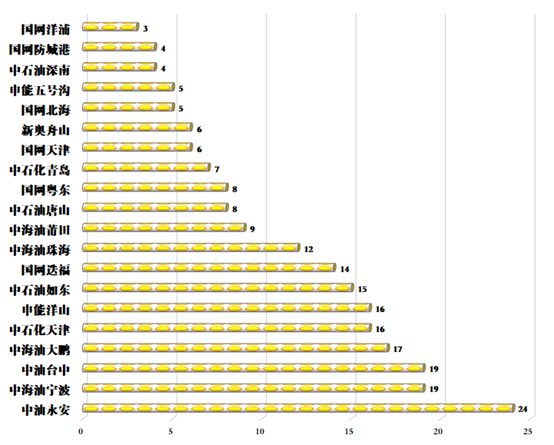 2022年6月,中油永安(ān)、中海油(yóu)寧波、中油台中、中海油大鵬、中石化天津、申能洋山分別以24天、19天、19天、17天、16天、16天的船舶在港天數(包含卸船、裝船船舶在港天數,不含國網天津浮(fú)式船在港天數)排名前六。