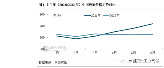 通過圖1可(kě)以看出,2021年與2022年上半年中(zhōng)國液(yè)氮價格走勢差異明顯,2021年呈現“先抑後揚”的態勢,2022年則顯現“先抑後揚再震蕩”。據卓創資訊數據監測,2022年上半年中國液氮均價為549.87元/噸,比(bǐ)2021年上半年跌6.51%。