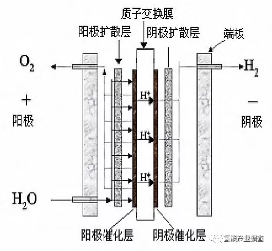 PEM水電解槽主要(yào)部件由內到外依次是質子(zǐ)交換膜、陰陽極催(cuī)化層、陰陽極氣體擴散層、陰陽極端板等。其中擴散層、催化層與質子交換膜組成膜電極,是整個(gè)水電解(jiě)槽物料傳輸以及電(diàn)化學反應的主場所,膜電(diàn)極特性與結構(gòu)直接(jiē)影響PEM水電解(jiě)槽的(de)性能(néng)和壽命。