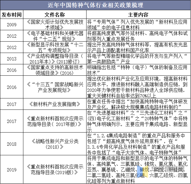 國家產業政策保(bǎo)駕護(hù)航,進口(kǒu)替代有望加速推進。特種氣(qì)體作(zuò)為關鍵性材料,是我國產(chǎn)業政策重點支持發展的高新技術(shù)產業之一,近年來不斷得到國(guó)家政策的大力支持。自2009年以來(lái),國家發改委、科技部、工信部、財政部等多部門相(xiàng)繼出台多部新興產業相關政策,均明確提及並部署了(le)氣體產業的發展,並且對於特種氣體(tǐ)確立了其(qí)新材料產業屬性,有力推動了特種氣體(tǐ)產業的發展。