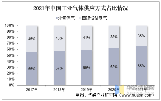 工業氣(qì)體(tǐ)的製氣模式有自建設備製氣和(hé)外包供氣,我國外包供氣市場份額從2017年的55%增至2021年的(de)65%,但與發達(dá)國家80%的外包率仍有差距。