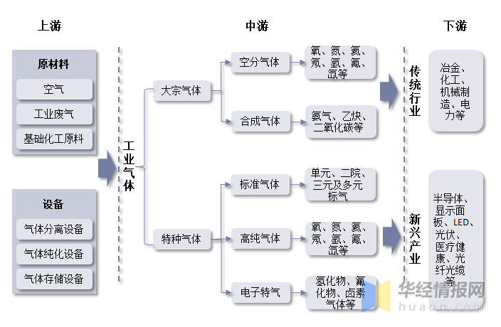 工業氣體行業上遊原材料主要為空氣、工業廢氣(qì)、基礎化學原料等,上遊行業主(zhǔ)要為設備供應商(空分(fèn)設備(bèi)、提純設備、儲罐等儲存容器設(shè)備、槽車等運輸設備)、電力(lì)供應商、基礎化學原料供(gòng)應商等。工業氣體行業的下(xià)遊行業(yè)主要為電子半導體(tǐ)、生物(wù)醫(yī)藥、新能源、冶金、化(huà)工、機械(xiè)、電力、建材、照明、食品、農業等行業,下遊應用廣泛,單一下遊行業的經(jīng)濟波動對工業氣體行業的影響較小。其中,普通工業(yè)氣體終端用戶市場主要集中在冶金和化工等(děng)傳(chuán)統行業,特種氣體終端用戶市場主要(yào)在電子半導(dǎo)體、生物醫藥、新能源等領域。