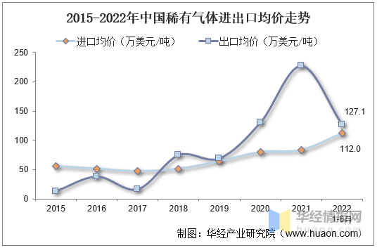 從稀有氣體進出口均價來看,由於“28042900”稀有氣體統計(jì)類目包含多種氣體,因此從整體上來分析(xī),我國近年來稀有氣(qì)體(tǐ)進出口均價整體保持上(shàng)漲。2022年1-6月,我國稀有氣體進口均價為112.0萬美元/噸,出口均價為127.1萬美(měi)元/噸。