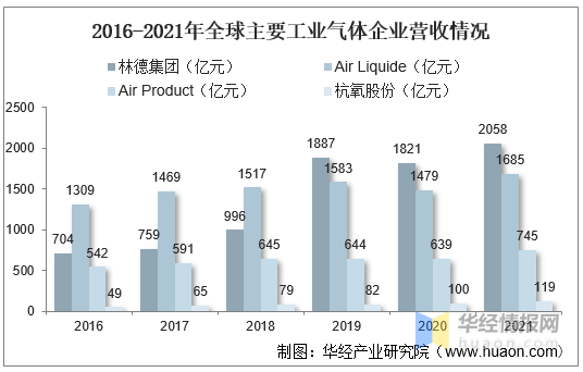 2016-2021年全球主(zhǔ)要工業氣體企業營收情況