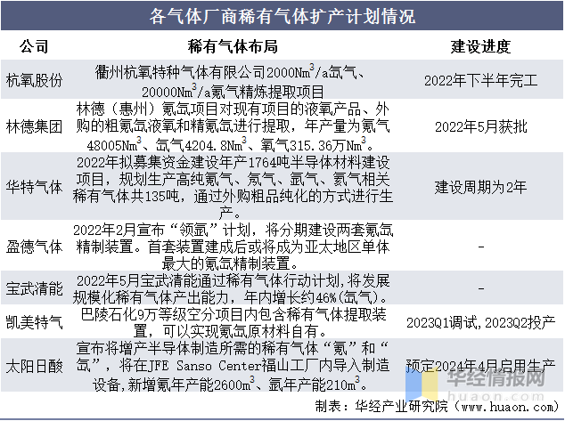 各氣體廠商稀有(yǒu)氣體擴產計劃情況