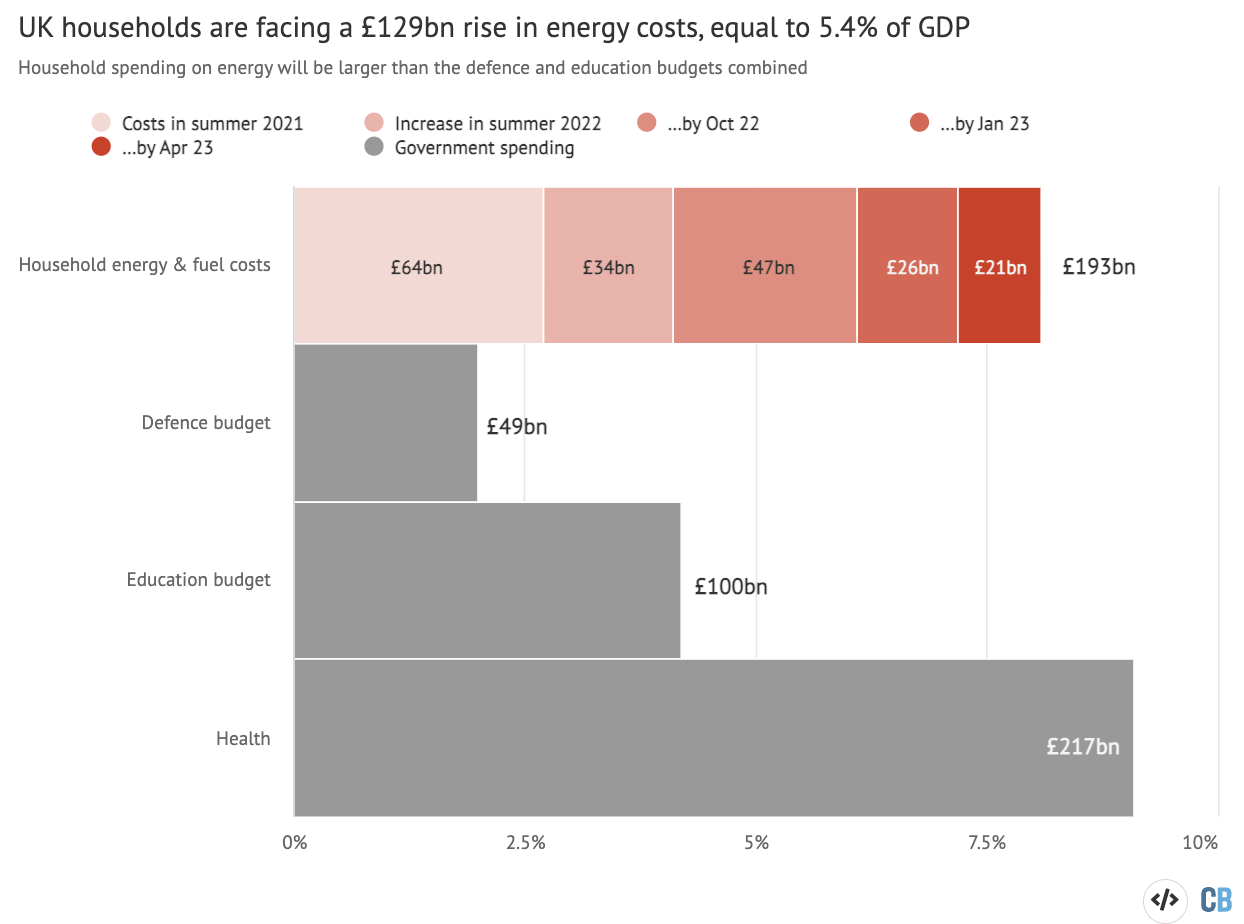 英國家庭能源賬(zhàng)單已經達到(dào)了至少半個世紀以來的最高水平,平均每戶將超過5000英鎊。總體(tǐ)而言,英國家庭能源成本將達到每年1930億英鎊(bàng)(占GDP 8.1%),這意(yì)味著家庭將麵臨的能源(yuán)成本將超過英國(guó)政府教育支(zhī)出(1000億英鎊)和國防預算(490億英(yīng)鎊)的總和。