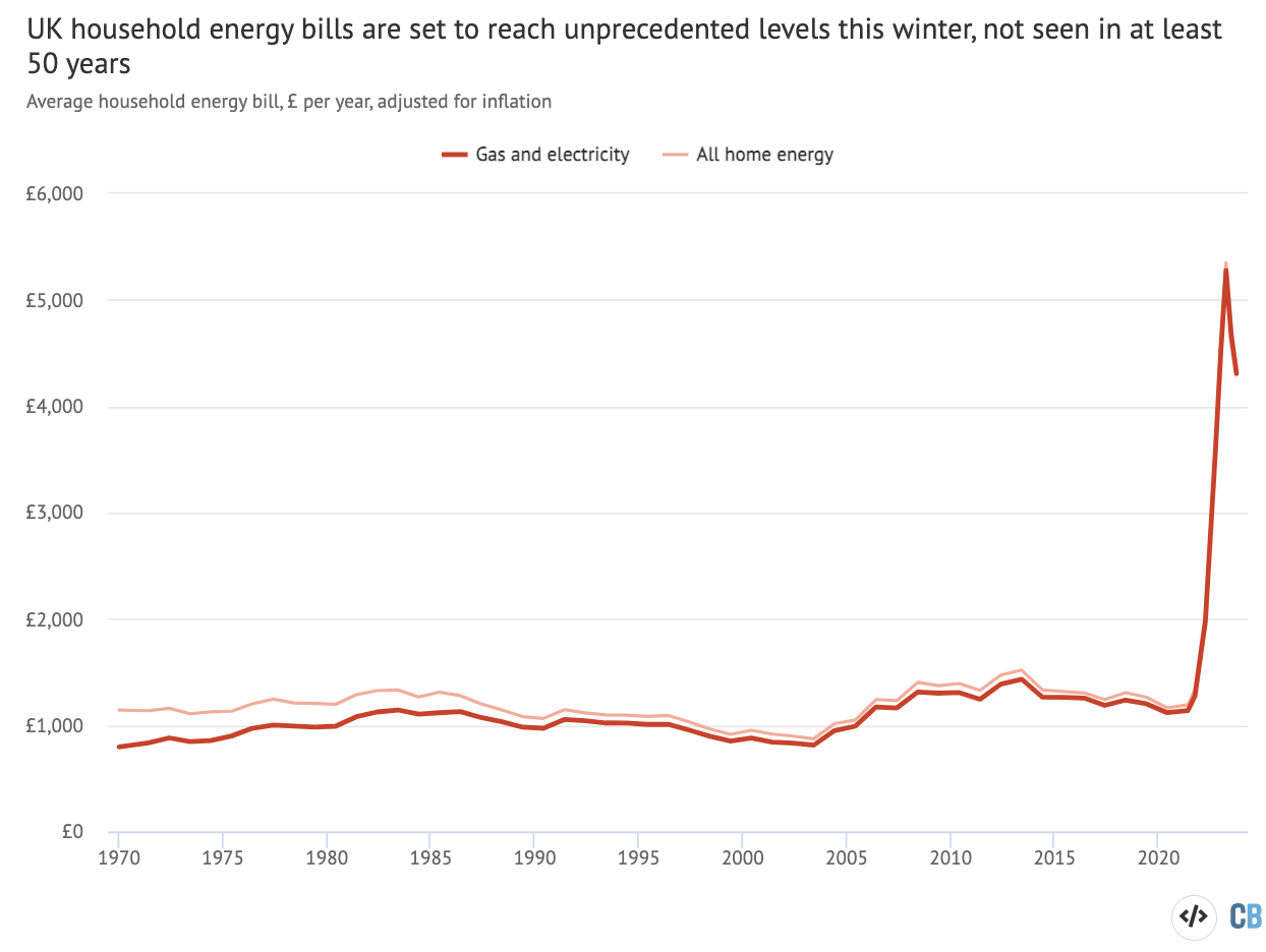 根據專業谘詢公司的最新(xīn)預測,10月份英國國內能源賬單上限將從目前平均(jun1)家庭每年1971英鎊的水平增至3523英鎊,增幅為79%。預計上限將在2023年1月1日再次(cì)增(zēng)加,然後在4月1日(rì)進一步增加,最高可達5038英鎊。這樣,英國居民能源賬單在(zài)短短18個月(yuè)內增加了四倍(bèi)多,普(pǔ)通家庭的(de)燃氣和電費,幾乎是1970年的三倍。