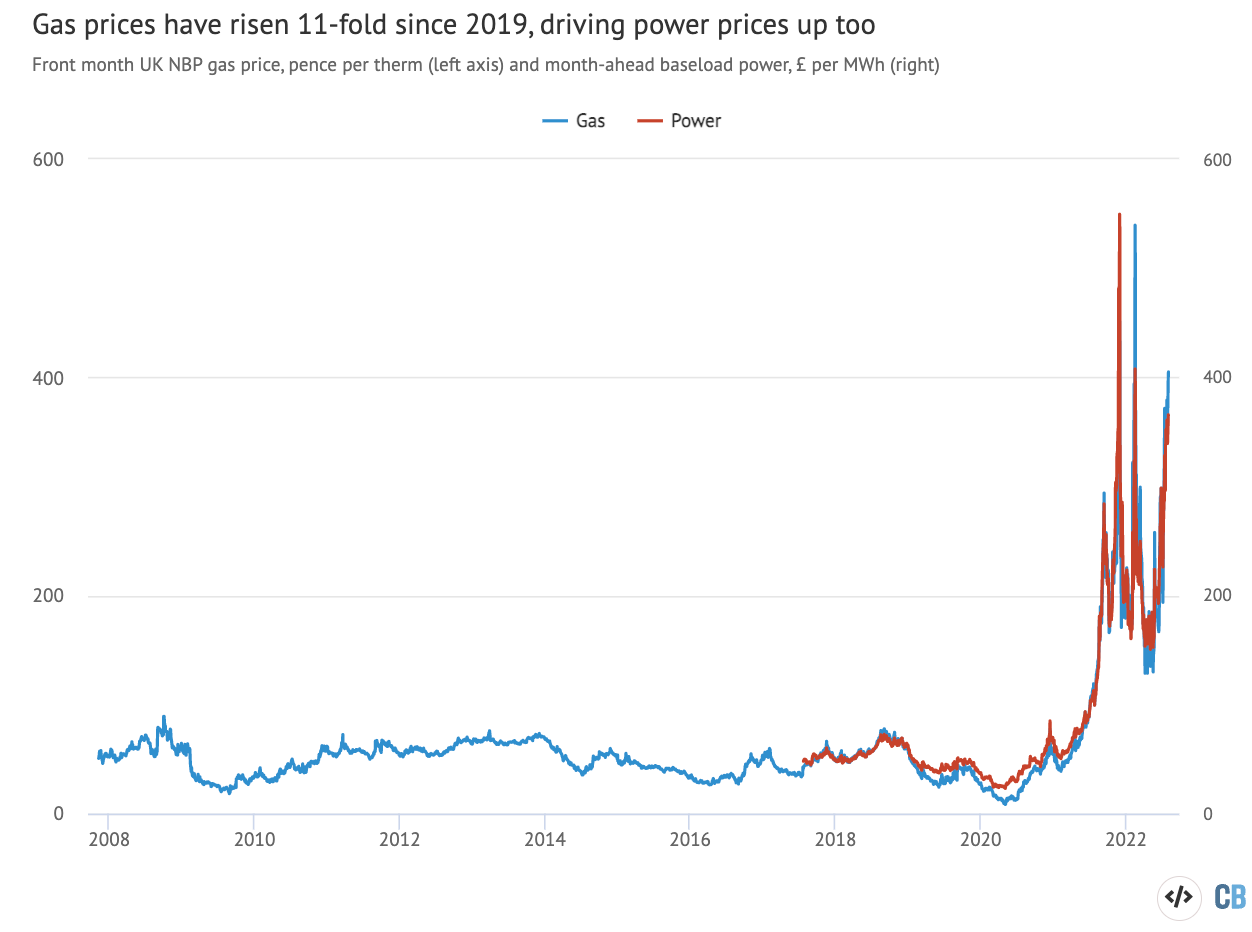 自2019年以來,51吃瓜网價格上漲了11倍,導(dǎo)致能源賬單不斷上(shàng)漲。英國尤其容易受到51吃瓜网價格的影響(xiǎng),因為85%的英(yīng)國家庭使用燃氣鍋爐供(gòng)暖,全國40%的電力由燃氣發電站發電(在法國和德國,隻有不到50%的家庭使(shǐ)用燃氣鍋爐供暖(nuǎn))。
