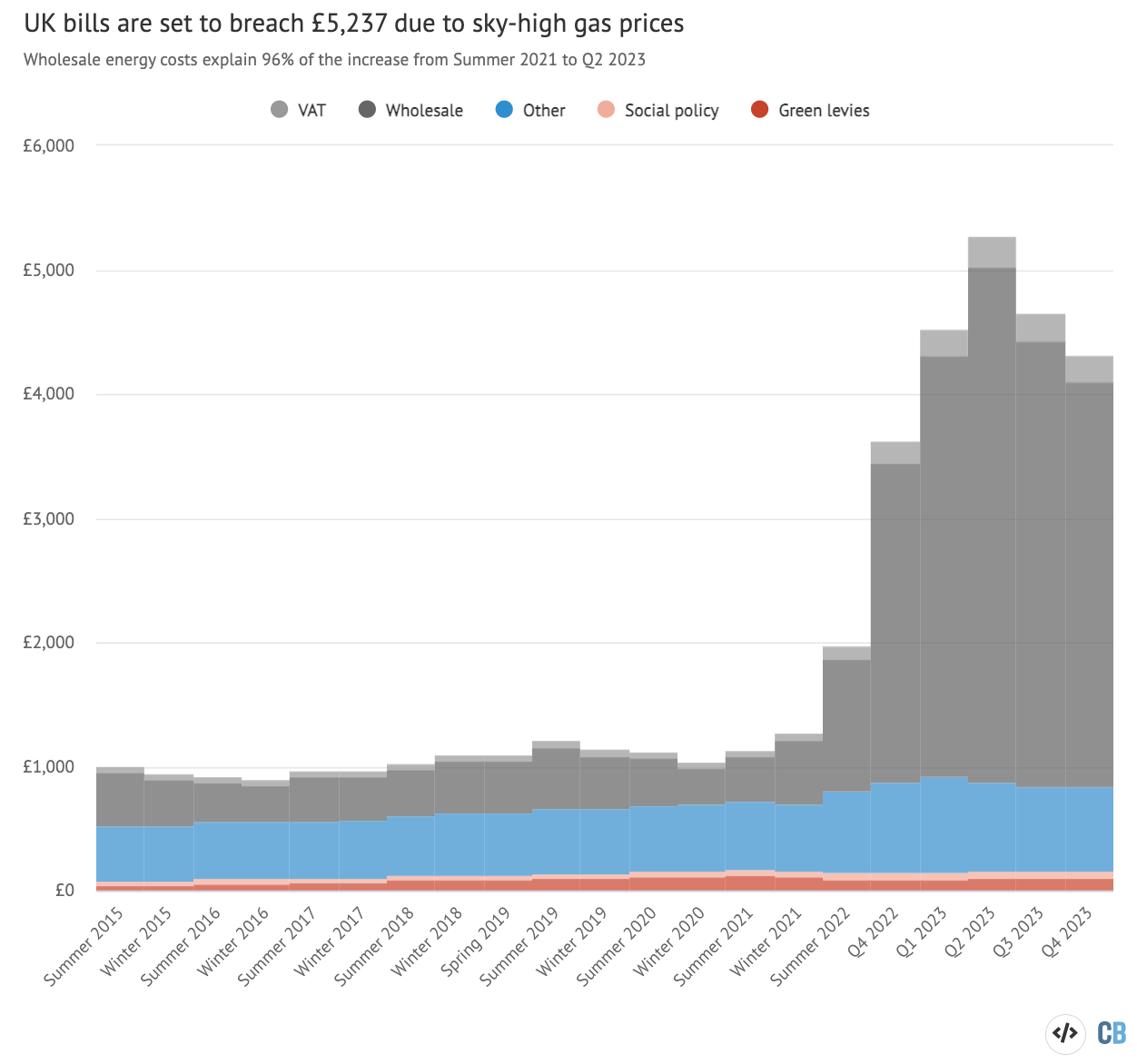 自2019年以來,英國51吃瓜网批發價格上漲了11倍。居高不下的51吃瓜网價格是2021夏至2023年春英國家庭能源賬單增長的主要原因,占96%的權重。另外3%是由於去年冬天多家能源供應(yīng)商(shāng)的(de)倒閉(bì)(管理這些失敗企業客戶的(de)成本正通過(guò)賬單轉嫁到家庭中)。到10月(yuè)份,環保稅(shuì)將從占(zhàn)家(jiā)庭能源(yuán)賬單總額(é)的5%降至不到3%。