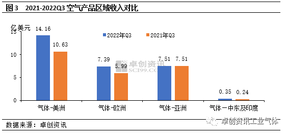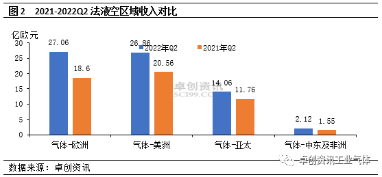 法液空:從各區(qū)域氣體服務收入來看,歐洲地區收入為27.06億(yì)歐元(yuán),同比增長45.5%,主要受能源價格高漲影響,通用工業領域氣體產品價格(gé)上升,並抵消了大工(gōng)業方麵(miàn)的(de)收入下降。此外,醫療保健領(lǐng)域收入繼(jì)續增加;美洲地區收入為26.86億歐(ōu)元,同比增長30.6%,一方麵受需求平穩及新設備投產支撐;另一方麵,通用工業(yè)領域產品價格提升。此外,電子行業需求強勁(jìn)已(yǐ)形成明顯支撐。亞太地區收入為14.06億歐元,同比增長(zhǎng)19.6%,主要得益於電子行業的需求支撐,中國因特殊(shū)態勢影響,大工業方麵表現欠佳。中東及非(fēi)洲地區收入為2.12億歐元,同比增長36.8%,主要因為埃及地區鋼鐵對(duì)氧氣的需求強勁以及沙特局部氫氣需求增加支撐。