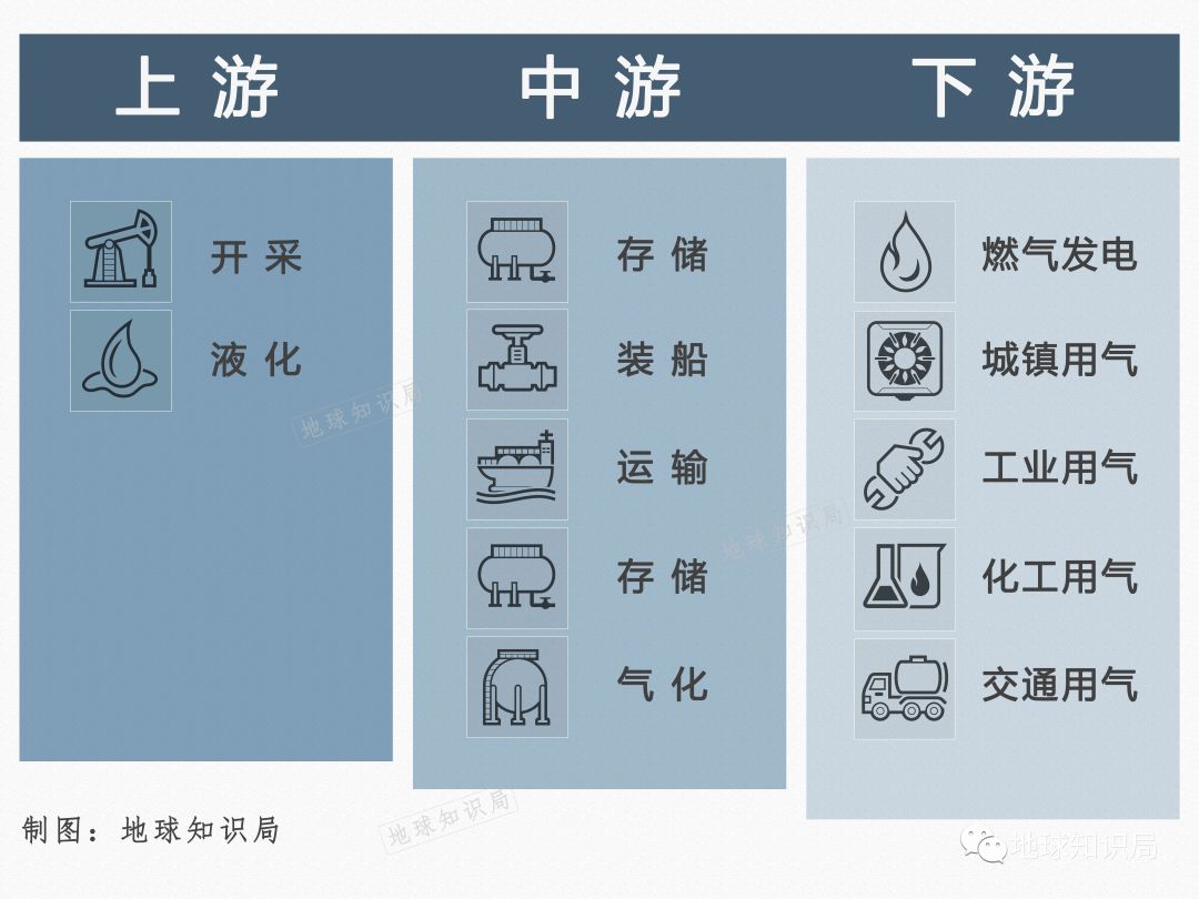 LNG的產業鏈可簡(jiǎn)要概括為:勘探開采和預(yù)處理,液化,運輸,接收(shōu)儲存和再氣化以及運往終端市場。這條產業鏈中比較關鍵環節的就是液化廠、運輸船和接(jiē)收站。具備液化能力是能夠出口LNG的必要條件之一。
