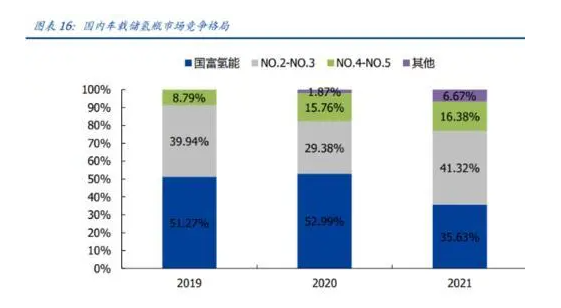 從(cóng)出貨量來看,國富氫(qīng)能 2021年市占率達(dá) 35.63%,位居第一(yī),其次是中材科技;但行業集中度呈持續下降的趨勢,CR3份額從 2019 年的(de)91.21%下滑至2021年的 76.95%,當(dāng)前氫(qīng)能產業正處於風口,企業數量不斷增(zēng)長或將成為常態。